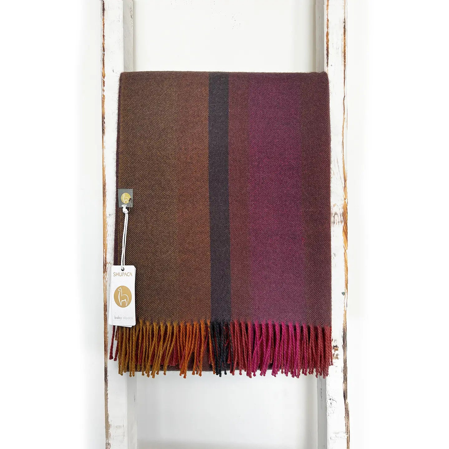 Our Striped Spiced Apple throw blanket in a stunning wine color is an accurate statement of sophistication. Transform any space into a haven of elegance, as this exquisite accessory enhances your room's visual appeal and atmosphere. It is versatile in size and effortlessly serves as a charming throw on your bed or sofa and can accompany you on your travels as a comforting blanket. Handcrafted from the finest premium baby alpaca fiber, known for its unparalleled softness and warmth, this meticulously woven masterpiece is the perfect choice for a caring gift. Size: 51" x 71" Materials: 100% Baby Alpaca Care: Dryclean Only