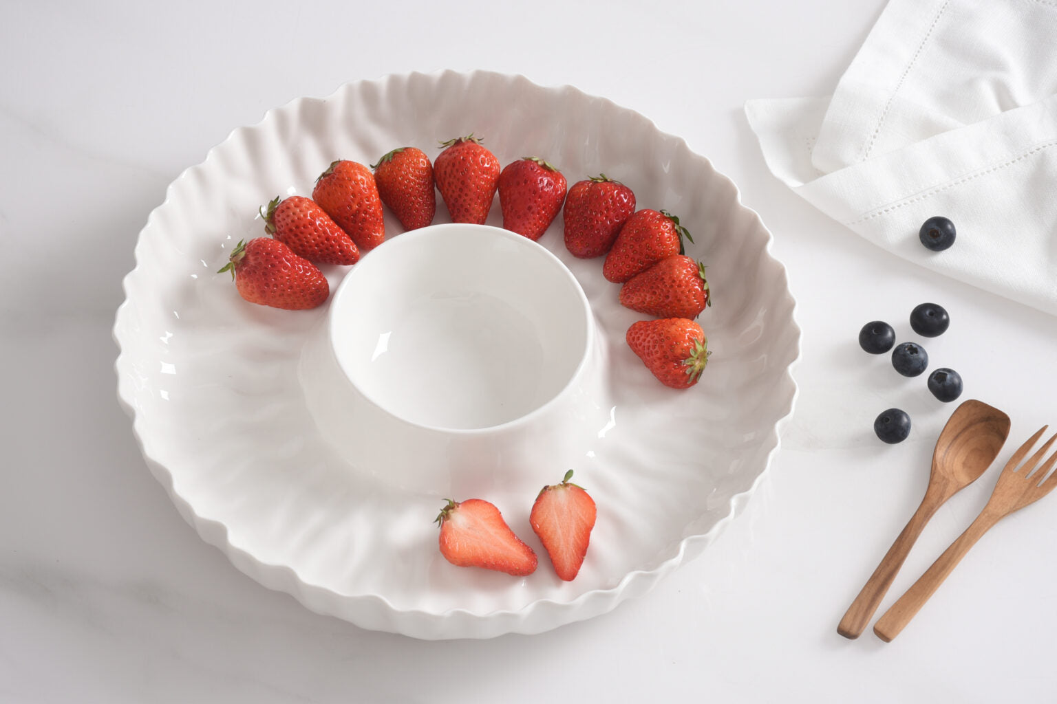 Chip and Dip in our Mascali Bianca Collection. Perfect for any dip combo: hummus and pita, salsa and tortilla chips, veggies and ranch or our favourite berries and whipped cream! Versatile high-fired porcelain pieces that are microwave safe! Food-safe, tarnish-free, dishwasher-safe, oven-safe to 500. Easy Care.